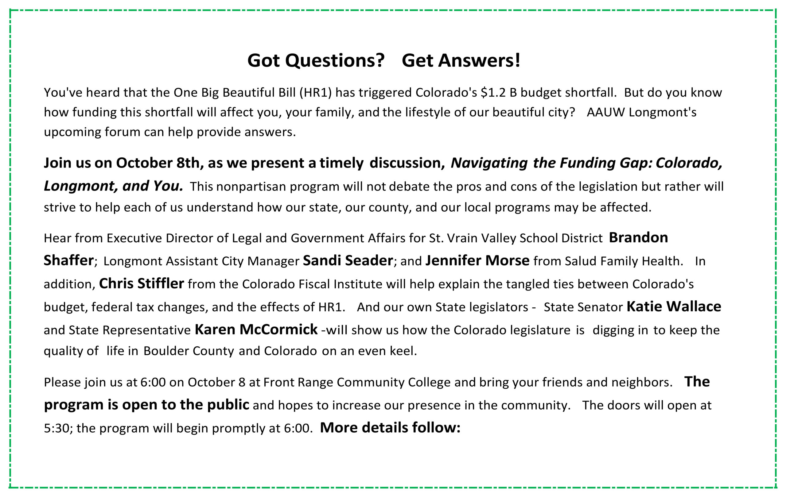 You’ve heard that the One Big Beautiful Bill (HR1) has triggered Colorado’s $1.2 B budget shortfall. But do you know how funding this shortfall will affect you, your family, and the lifestyle of our beautiful city? AAUW Longmont’s upcoming forum can help provide answers.